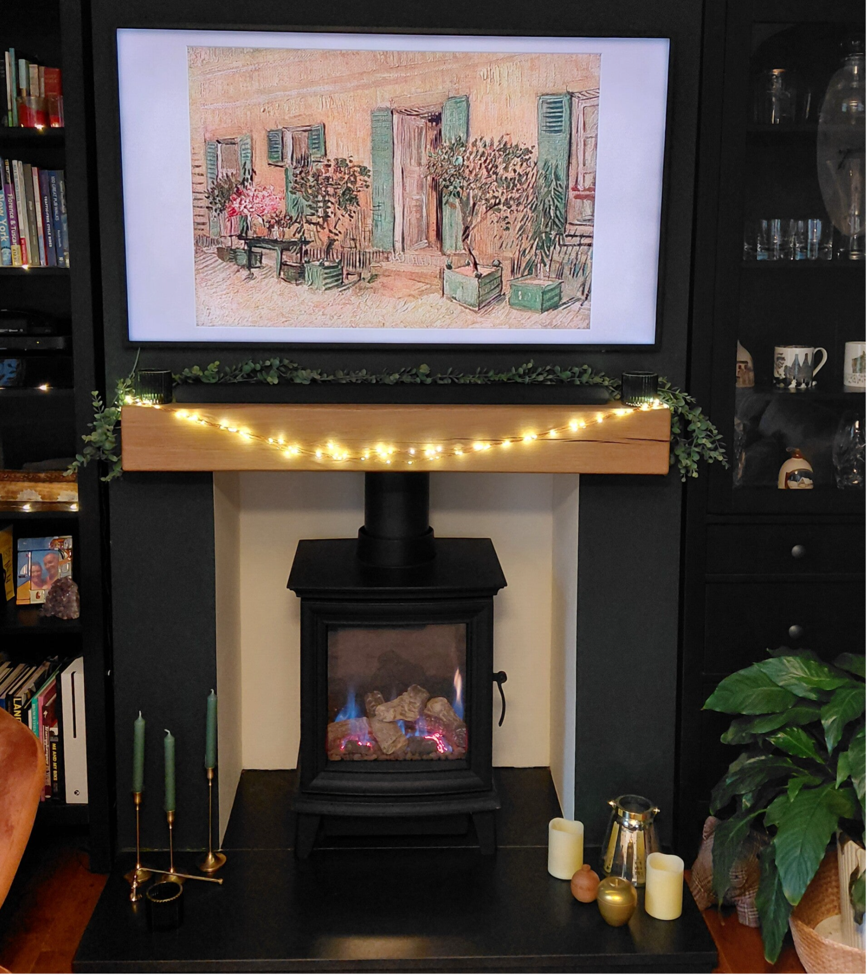 Featuring a sleek black stove, soft fairy lights, lush greenery and curated décor, this design combines warmth, texture and timeless elegance.